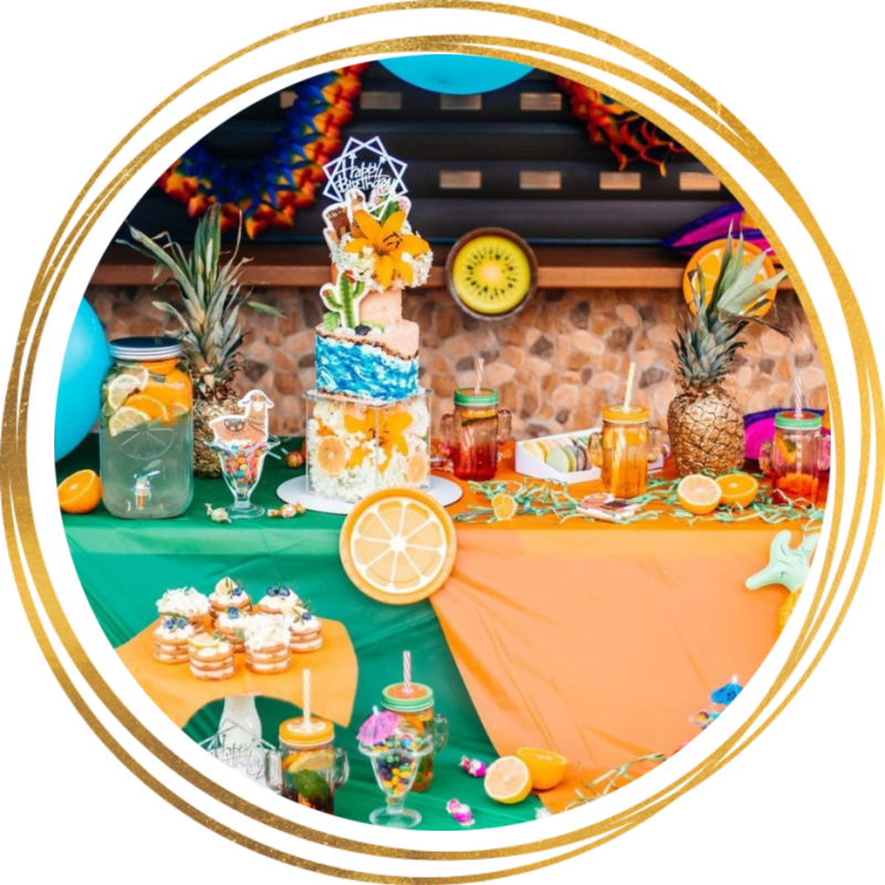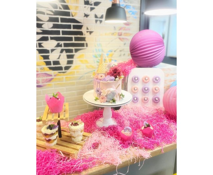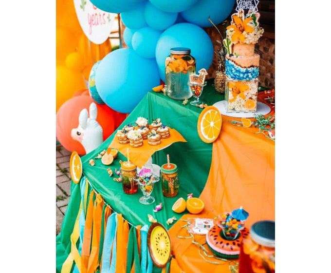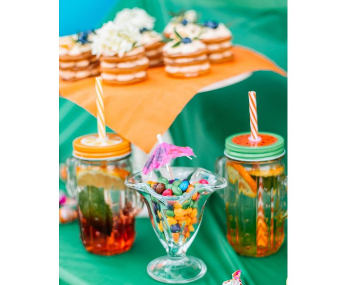 Представьте себе красочную и аппетитную локацию на празднике с милыми столиками и посудой, вкусными угощениями и напитками. Мы сделаем кэнди-бар на любой вкус, обустроим пространство для сладких и полезных перекусов – фруктов, соков и конфет из сухофруктов.